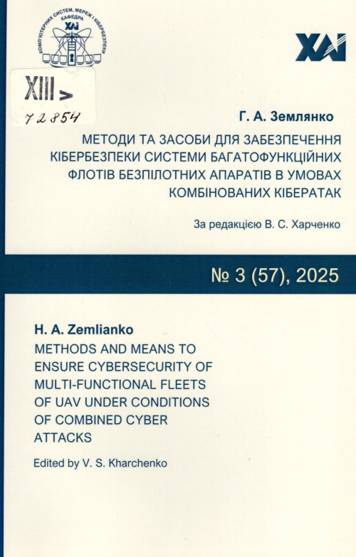 Землянко Г. А. Методи та засоби для забезпечення кібербезпеки системи багатофункційних флотів безпілотних апаратів в умовах комбінованих кібератак : монографія / Георгій Андрійович Землянко ; Нац. аерокосм. ун-т ім. М. Є. Жуковського "Харківський авіаційний інститут" ; за ред. В. С. Харченко. – Харків : Бровін О. В., 2025. – 159 с. : рис., табл. – Methods and means to ensure cybersecurity of multi-functional fleets of UAV under conditions of combined cyber attacks.