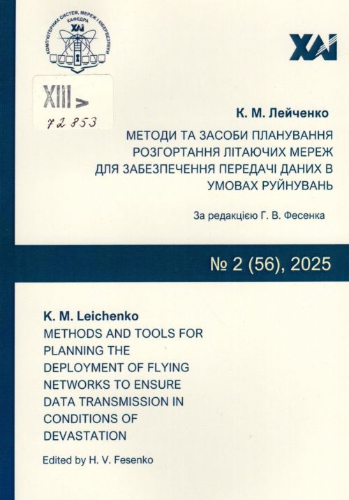 Лейченко К. М. Методи та засоби планування розгортання літаючих мереж для забезпечення передачі даних в умовах руйнувань : монографія / Кирило Миколайович Лейченко ; Нац. аерокосм. ун-т ім. М. Є. Жуковського "Харківський авіаційний інститут"; За ред. Г. В. Фесенко. – Харків : Бровін О. В., 2025. – 145 с. : рис., табл. – Methods and tools for planning the deployment of flying networks to ensure data transmission in conditions of devastation.