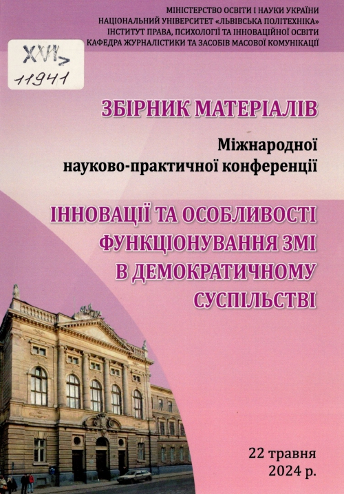 Інновації та особливості функціонування ЗМІ в демократичному суспільстві : зб. матеріалів Міжнар. наук.-практ. конф., 22 травня 2024 р. / Нац. ун-т "Львівська політехніка". Ін-т права, психології та інновац. Освіти ; упоряд. Ю. Р. Казімова ; гол. редкол. З. В. Галаджун ; редкол. Б. В. Іваницька, М. О. Кіца. – Львів : Вид-во Львівської політехніки, 2024. – 181 с. : іл.