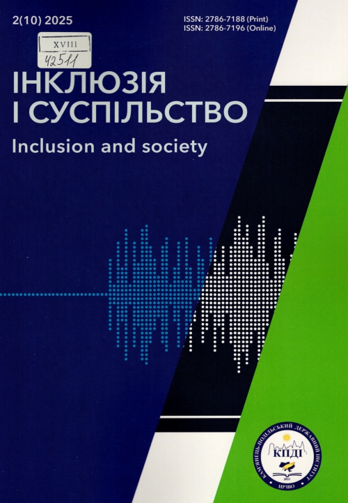 Інклюзія і суспільство = Inclusion and society : наук. журн. / Засновник Навч.-реабілітац. закл. вищ. освіти "Кам'янець-Подільський держ. ін-т" ; гол. ред. Мар'ян Миколайович Тріпак. – Кам'янець-Подільський ; Одеса : Гельветика, 2025. – Вип. 2 (10). – 108 с.