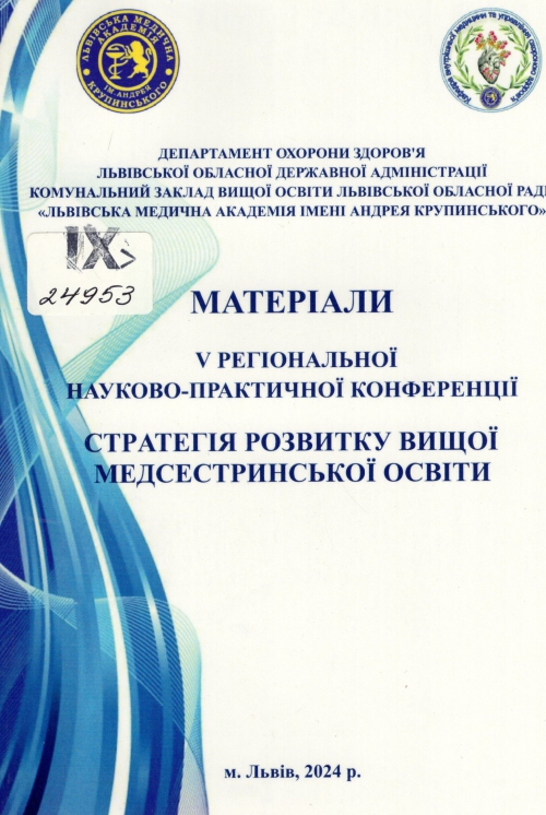 Стратегія розвитку вищої медсестринської освіти : матеріали V регіон. наук.-практ. конф., м. Львів, 28 жовтня 2024 р. / Департамент охорони здоров'я Львів. облдержадм., КЗВО Львів. обл. ради "Львів. медична академія імені Андрея Крупинського" ; гол. оргком. Ю. Я. Кривко ; оргком. О. В. Яремчук, М. Т. Жубрид, Н. Р. Фітьо ; редкол. Л. Д. Сойка, Ю. Р. Согуйко, О. О. Стоколос-Ворончук. – Львів : Вид-во Львівської політехніки, 2024. – 153 с. : рис.