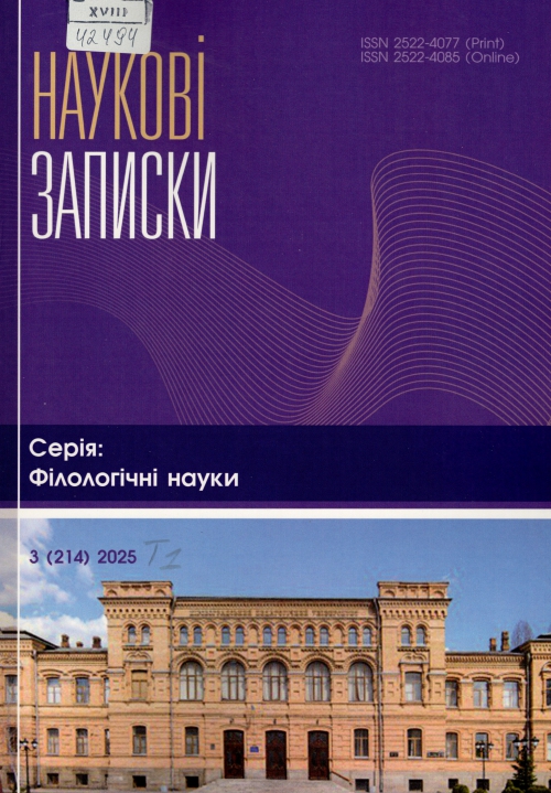 Наукові записки [Центральноукраїнського державного університету імені Володимира Винниченка]. Серія: Філологічні науки : наук. вид. / Засновник Центральноукр. держ. ун-т ім. В. Винниченка ; гол. ред. Сергій Павлович Михида. – Кропивницький : Гельветика, Кропивницький ; Одеса : Гельветика, 2025. – Вип. 3 (214), т. 1. – 316 с.