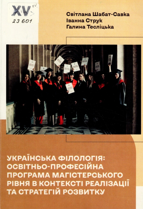 Шабат-Савка С. Т. Українська філологія: освітньо-професійна програма магістерського рівня в контексті реалізації та стратегій розвитку : навч.-метод. посіб. / Світлана Т. Шабат-Савка, Іванна М. Струк, Галина І. Тесліцька ; Чернів. нац. ун-т ім. Ю. Федьковича. – Чернівці : Чернів. нац. ун-т ім. Ю. Федьковича, 2024. – 247 с. : іл., табл., QR-коди.