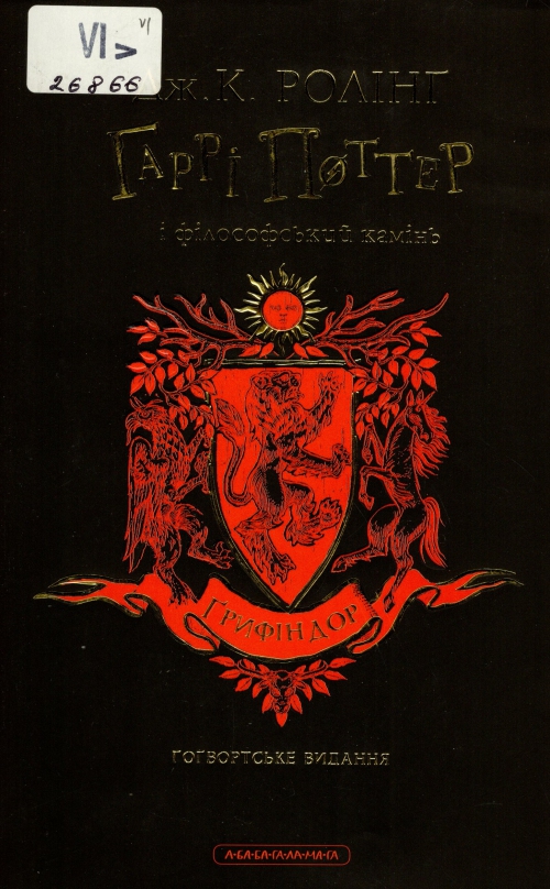 Ролінг Дж. К. Гаррі Поттер і філософський камінь : ґоґвортське вид. : Ґрифіндор : пер. с англ. / Дж. К. Ролінг; Пер. Віктор Морозов; За ред. І. Малкович; Іл. Леві Пінфолд.– Вид. 2-ге.– Київ : А-БА-БА-ГА-ЛА-МА-ГА, 2024.– XIII, 343, [3] с. : іл.– Гаррі Поттер і філософський камінь: ґрифіндорське видання